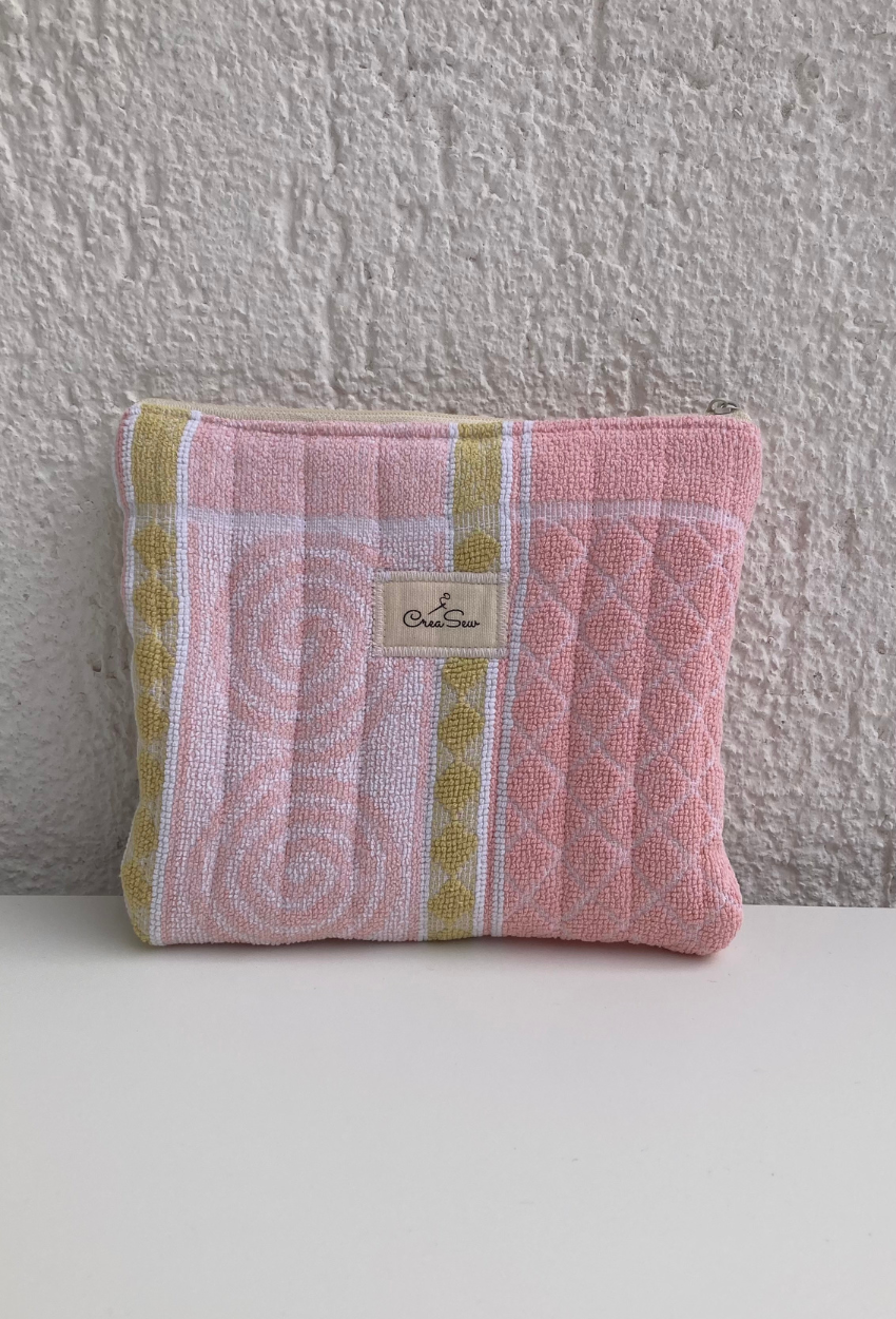 This quilted flat pouch, crafted from vintage towels cotton fabric, combines softness and durability. Its quilted structure offers gentle protection, while the zipper ensures easy and convenient access. Its slim design makes it the perfect companion for slipping into any bag. Use it to organize makeup, cards, essential oils, medicine, or any small essentials you need on hand. Perfect for keeping your essentials organized in style.