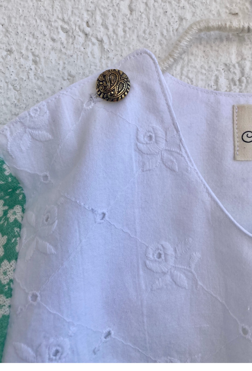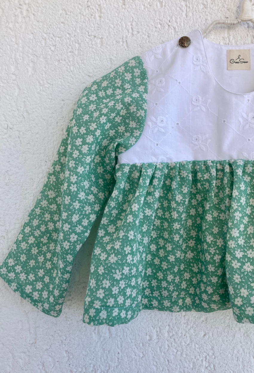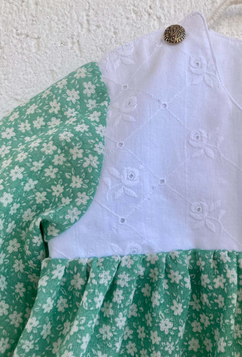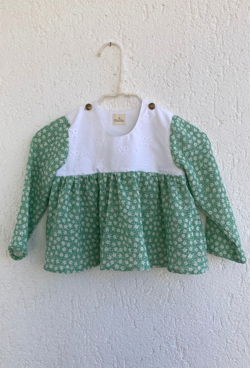 The blouse is made of cotton gauze with small daisies and a white cotton fabric embroidered from an old bed sheet. It is beautifully finished with two buttons that allow you to open the blouse for easy dressing.