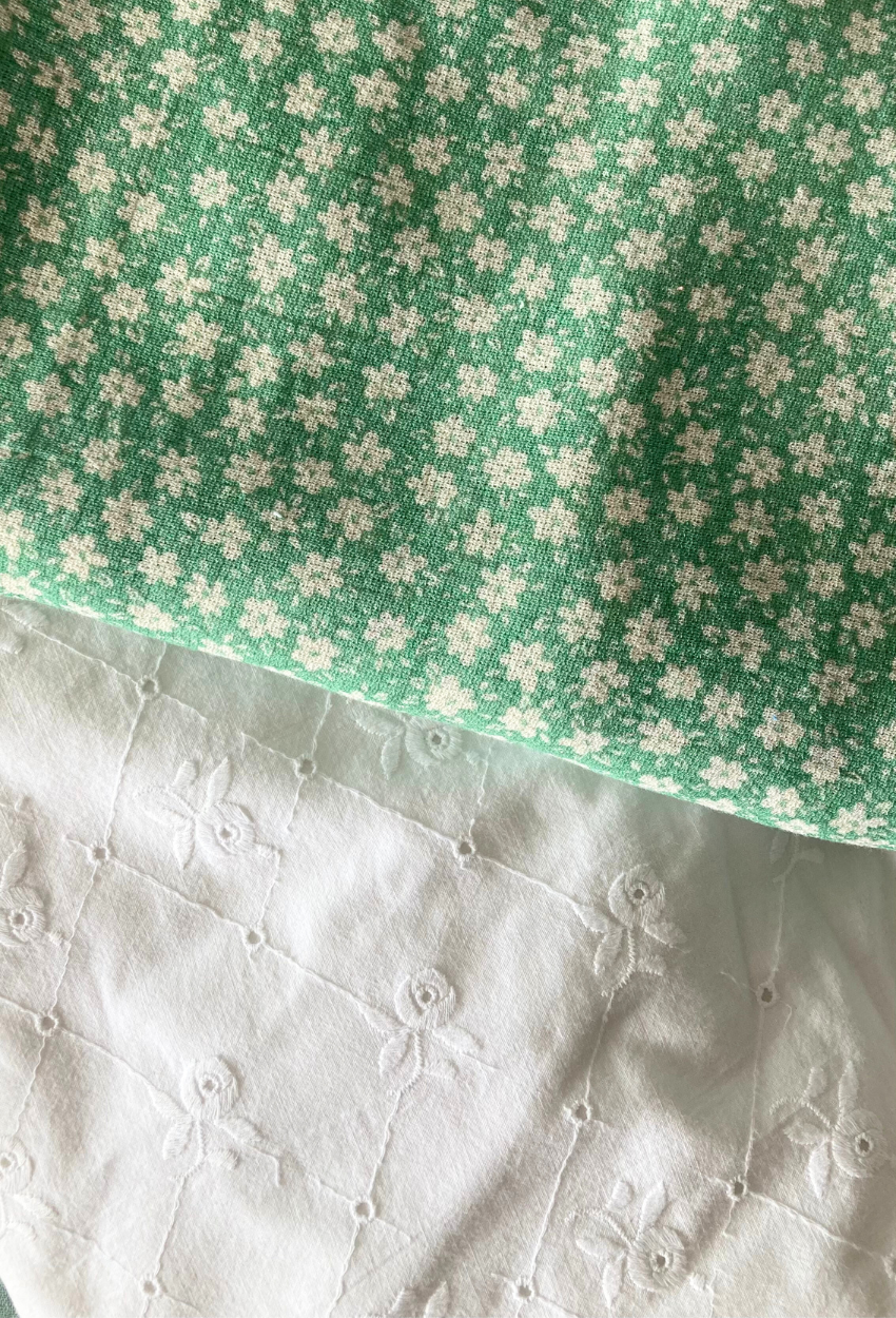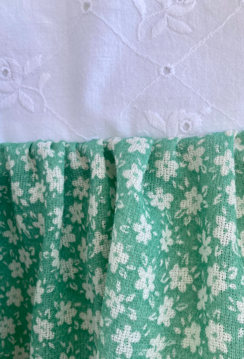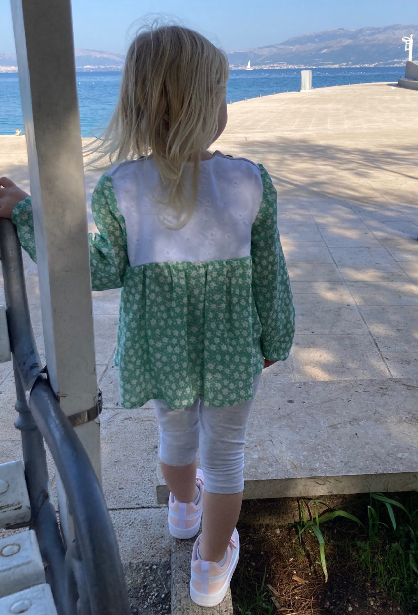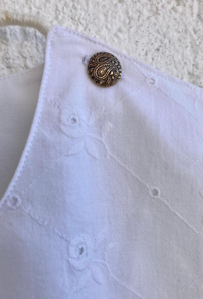 The blouse is made of cotton gauze with small daisies and a white cotton fabric embroidered from an old bed sheet. It is beautifully finished with two buttons that allow you to open the blouse for easy dressing.