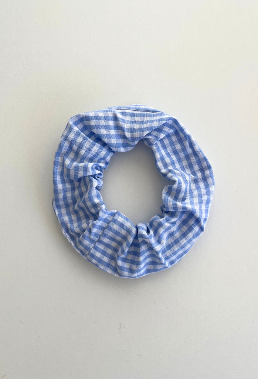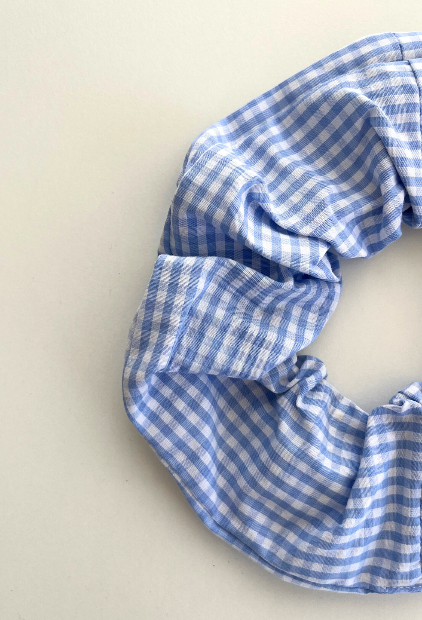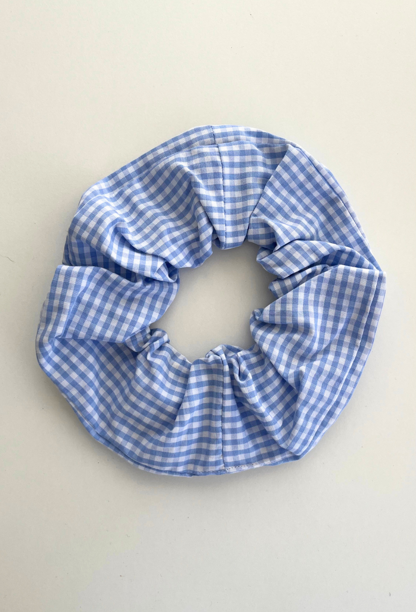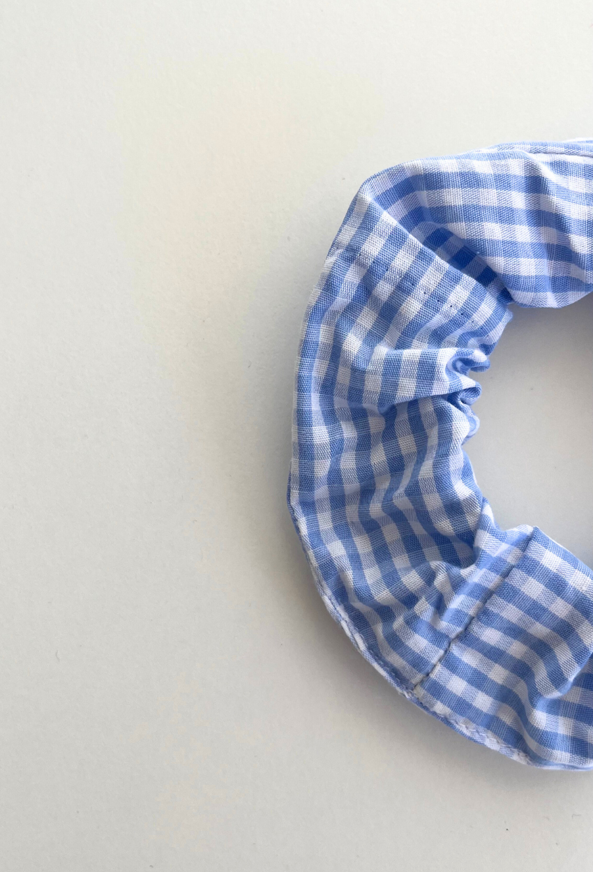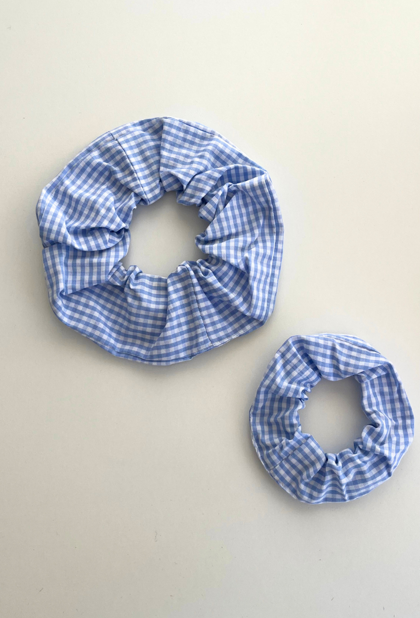 Matchy Matchy blue and white gingham scrunchies for adults and kids, made from cotton. Scrunchies are crafted from fabric scraps. All CreaSew products are made from upcycled clothing or vintage household linens.